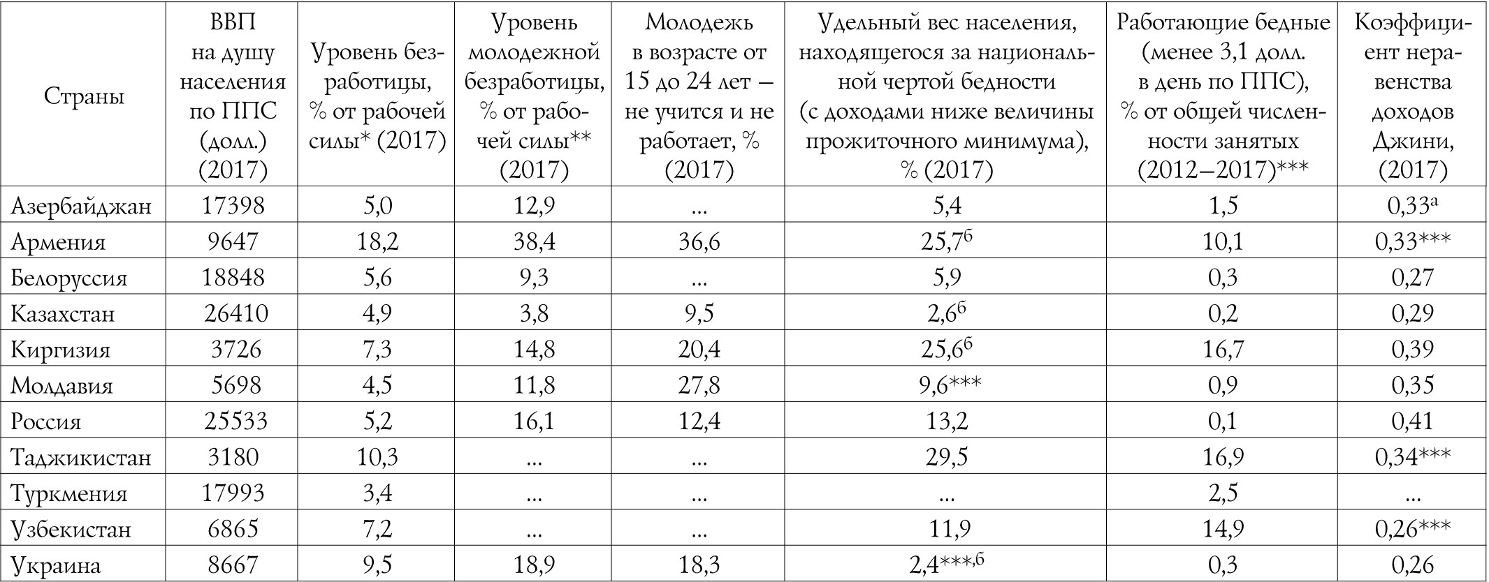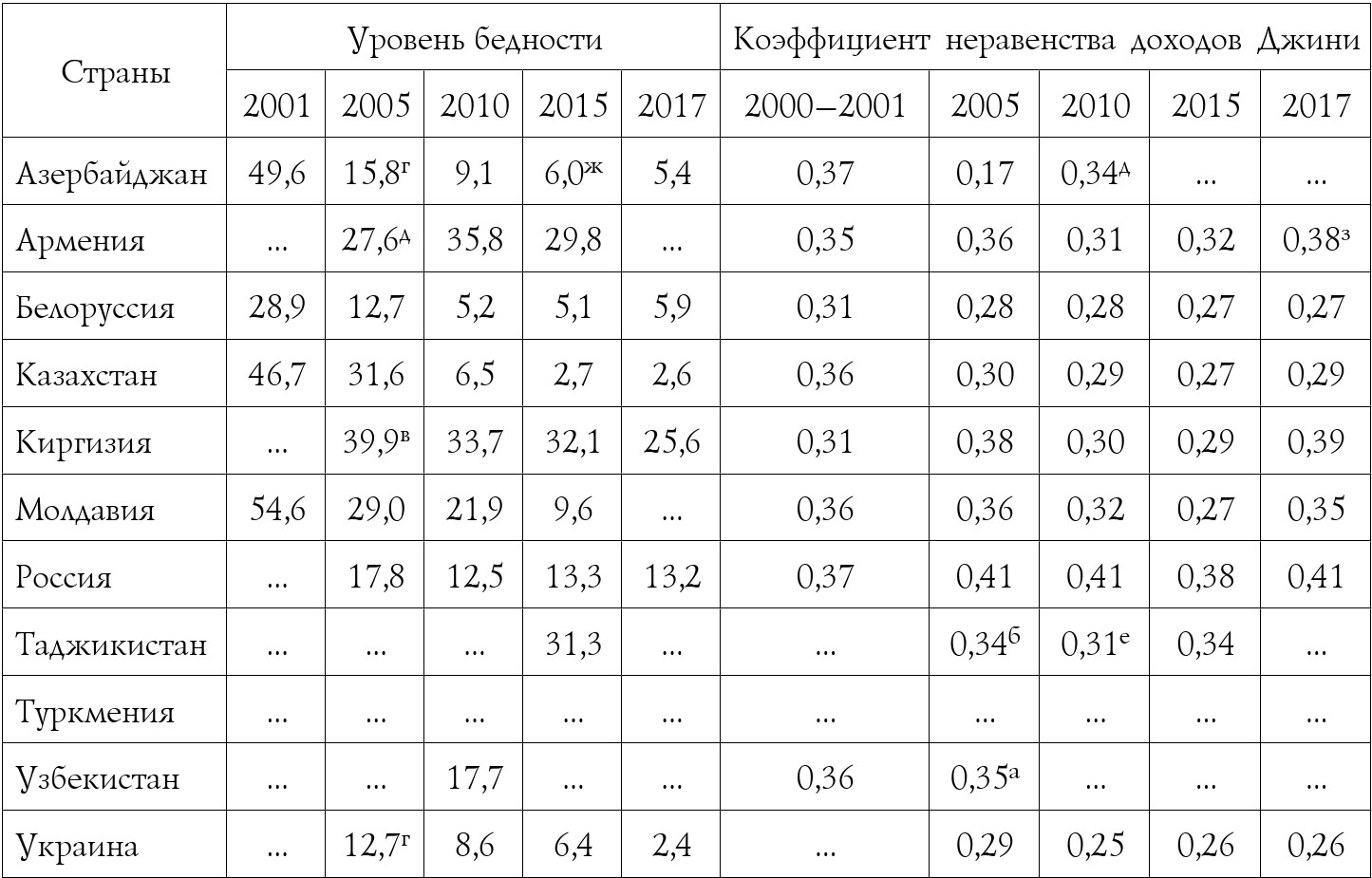Источники: Мониторинг показателей качества жизни населения в странах Содружества Независимых Государств 2014–2017. М.: Межгосударственный статистический комитет СНГ, 2018. С. 12; Мониторинг показателей ЦУР в регионе СНГ 2015–2017. М.: Межгосударственный статистический комитет СНГ, 2019. С. 19; Мониторинг состояния национальных рынков труда стран Содружества Независимых Государств 2014–2017. М.: Межгосударственный статистический комитет СНГ, 2018. С. 44; Содружество Независимых Государств в 2017 году. М.: Межгосударственный статистический комитет СНГ, 2018. С. 146; Анализ развития уровня жизни и благосостояния населения в Республике Узбекистан / Государственный комитет Республики Узбекистан по статистике. С. 5; Россия в цифрах. 2017. М.: Росстат, 2017. С. 129; Human Development Indices and Indicators: 2018 Statistical Update. N.-Y.: United Nations Development Programme, 2018. Pр. 60–62; Human Development Report 2016: Work for Human Development. Washington, D. C.: UNDP, 2016. Pр. 250–252; Human Development Report 2015: Work for Human Development. Washington, D. C.: UNDP, 2015. P. 217; The World Bank (Data Sets). data.worldbank.org/indicator/SI.POV. GINI; data.worldbank.org/indicator/SL.UEM.TOTL.ZS; ; data.worldbank.org/indicator/SI.POV.NAHC/countries.