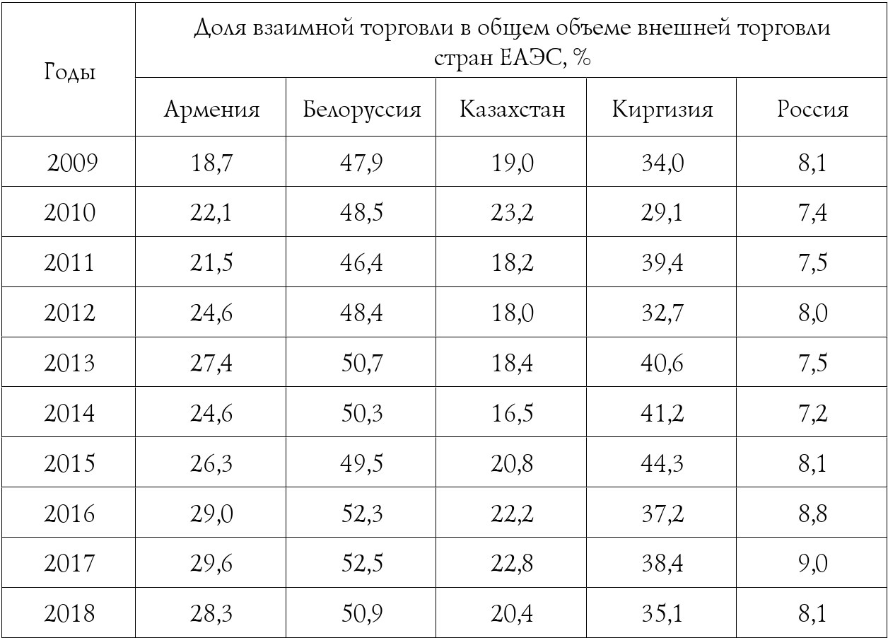 Таблица 4.2. Изменение доли взаимной торговли в странах ЕАЭС в 2009–2018 гг.