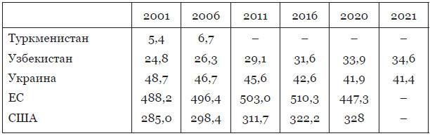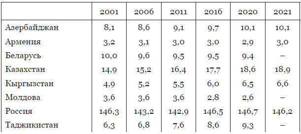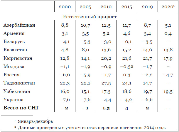 Как видно из приведенных выше данных, население всех стран, в настоящее время входящих в Содружество Независимых Государств, составляет около 300 млн. человек и за последние два десятилетия возросло примерно с 276,2 млн. чел. до 288,8 млн. чел. Его размеры сопоставимы и с населением 28 стран Европейского Союза, и с численностью населения США. Вместе с тем, динамика отдельных стран СНГ демонстрирует постоянный и устойчивый рост. Эта тенденция характерна, прежде всего, для Азербайджана, Казахстана, Узбекистана, Таджикистана, Кыргызстана. Практически не меняется численность населения Армении, Беларуси, Российской Федерации, и существенно сокращается число постоянных жителей Украины и Молдовы. Заметим, кстати, что и численность населения 28 стран ЕС в последнее десятилетие также сокращается, и его показатель в 2020 году снизился даже относительно данных на начало XXI века.