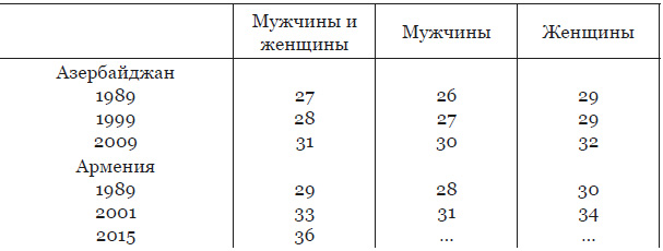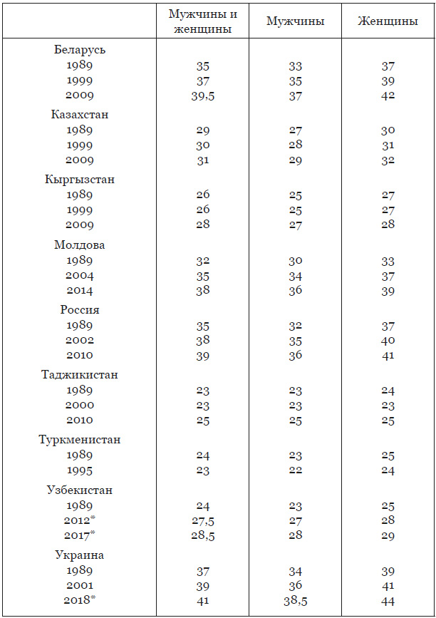 Данные Таблицы 2 характеризуют средний возраст населения государств-членов Содружества Независимых Государств по результатам проведенных в этих странах переписей населения в конце XX – начале XXI века, в ряде случаев приведены и результаты текущего статистического учета (Узбекистан и Украина). Они свидетельствуют и о значительной доле детей и молодежи в таких странах как, прежде всего, Кыргызстан, Таджикистан, Туркменистан, Узбекистан, Азербайджан, Казахстан, и о росте лиц среднего возраста и старше в ряде стран, особенно это характерно для Украины. Средний возраст женщин практически везде выше, чем у населения страны в целом и у мужчин, что явно свидетельствует о том, что продолжительность жизни женского населения выше[58].