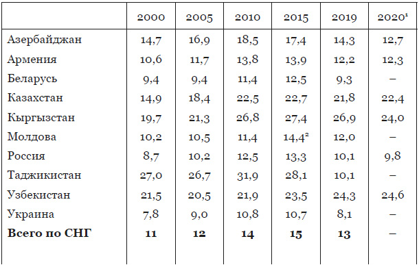 Содружество Независимых Государств, как и все другие интегрирующиеся экономики мира, оказалось перед лицом новых вызовов и угроз, связанных с проявлениями и последствиями пандемии короновируса в 2020 году. Введение ограничительных мер и падение мирового спроса на энергоресурсы оказали негативное влияние на экономику стран Содружества. В целом по СНГ по основным макроэкономическим показателям сложилась отрицательная динамика. Объем ВВП в 2020 году снизился на 3 % (в предыдущем году, до пандемии, он вырос на 2,5 %), промышленное производство по сравнению с 2019 годом снизилось на 2,6 %, (в 2019 г. – выросло на 3,2 %), сельскохозяйственное производство снизилось в 2020 году на 0,3 % (в 2019 г. наблюдался прирост – 3,1 %). Объем инвестиций в основной капитал в странах Содружества снизился в 2020 году на 4,6 %, а в предыдущем году наблюдалось увеличение данного показателя на 5 %[67].