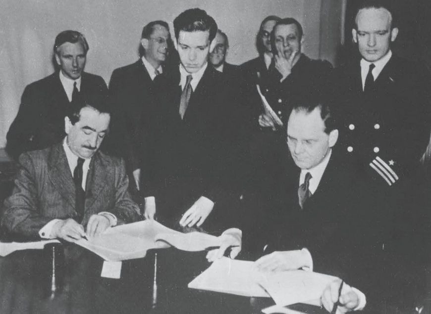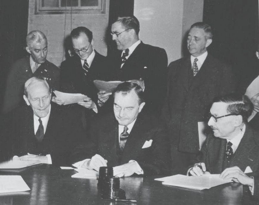 Лондон. 8 августа 1945 года. Подписание Соглашения об учреждении Международного военного трибунала. На снимке – вверху (слева направо): профессор А.Н. Трайнин, И.Т. Никитченко (СССР); внизу – Джоуитт (Великобритания); Р. Джексон (США); Р. Фалько (Франция).