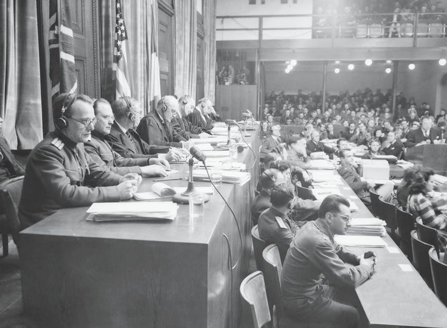 Международный военный трибунал (слева направо): А.Ф. Волчков, И.Т. Никитченко (СССР); Н. Биректт, Д. Лоренс (Великобритания); Ф. Биддл, Д. Паркер (США); Доннедье де Вабр (Франция).