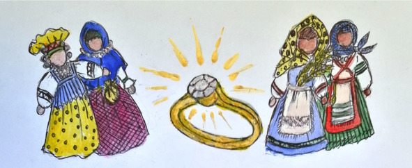 Варьюшка по дому хлопотала, а Ванюшка плотничал, только вот матушка их захворала. Болела она долго и вот матушки их не стало. Погоревали они, а потом сели вдвоём и стали думать, как им жить дальше. Ванюшка положил кольцо на стол и сказал: «Надо забыть о желании матушки. Нет такой девицы, которой будет в пору это кольцо». Взяла в руки кольцо Варьюшка и говорит: «Что же за такое кольцо, что никому не подходит?», – и надела колечко на палец. Ванюшка, увидев, что сестре оказалось кольцо в пору, сказал: «Так вот, кто должен стать моей женой!».
