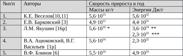 Н. П. Бетелев в своей работе [4] приводит такие данные, рассчитанные различными авторами, пытающимися обосновать рост массы и размеров Земли некими гипотетическими частицами «космического эфира» (Таблица 2).