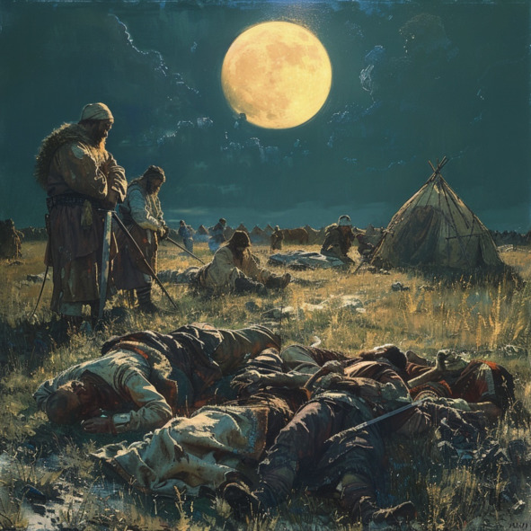 Хищной стаей окружили переяславцы доверившихся им степняков. По знаку воеводы палачи шагнули к палаткам. В них и повсюду вокруг, у тлеющих костров лежали спящие воины. Мерно вздымались могучие груди, а окутавшие сны продолжали нести храбрых батыров по родной степи, когда сверху обрушилась разящая сталь.