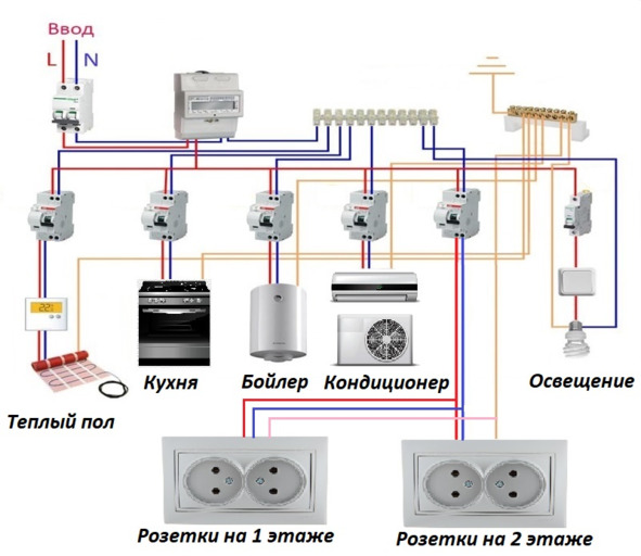 На обеих схемах указаны группы, направления потока напряжения в которых разделены по три. Три потока подачи напряжения являются минимальным количеством, направленных в дом. Где каждый из потоков «сидящий» на отдельном автомате УЗО, подпитывает свою группу электроприборов. Группы могут быть больше, 5, 10 или 20шт, на ваше усмотрение. Можно каждую комнату в доме «посадить» на отдельную группу. Чем больше будет групп, тем меньше нагрузки создастся на автоматы. Минимальное количество рекомендованных групп – три. Где на первую группу можно подключить все приборы освещения в доме. На вторую группу – розетки. На третью – кухонную зону, где приборами потребления являются: электрочайник, микроволновка, варочная панель, духовой шкаф и бойлер.