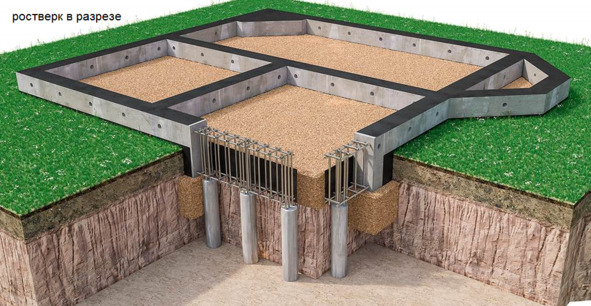 Ростверк лишь объединяет верхнюю часть свай и не несет нагрузки идущей от здания. Сваи при наличии такой конструкции, равномерно воспринимают нагрузку и передают ее грунт.