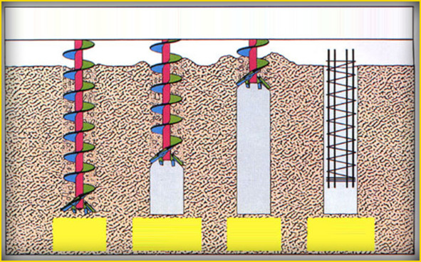 Если забивные сваи в основном используются на производстве из—за расходов на транспорт, то буронабивные не требуют наличия техники и могут монтироваться вручную. После пробуривания скважин (лунок),в них опускается арматурный каркас и заливается бетоном.