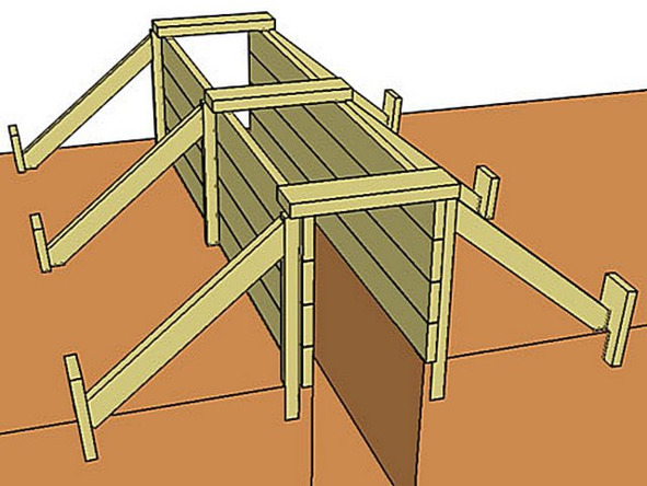 Щиты опалубки, расположенные по обе стороны монтируемого фундамента, (то есть параллельно по отношению друг к другу) необходимо «связать» между собой. Делается это по разному, в зависимости от типа опалубки. Если опалубка деревянная, то верхняя часть, после выравнивания, скрепляется брусками или рейками.