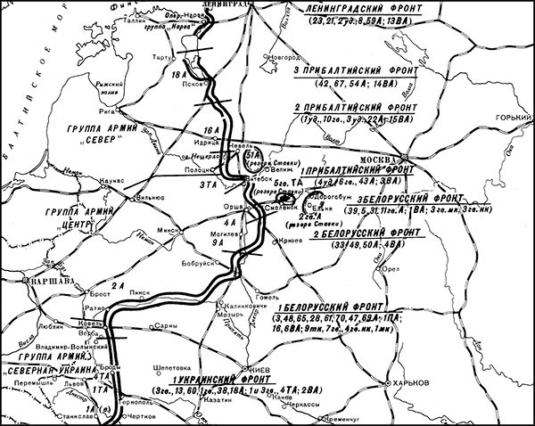Перед началом Белорусской операции в Генеральном штабе было решено провести целый ряд крупных наступательных операций войск Красной Армии на огромной территории, простиравшейся от Карелии до Карпат. По разработанному плану первоначально в начале июня 1944 года активные боевые действия начинали войска Ленинградского и Карельского фронтов, за которыми и следовало наступление наших войск в Белоруссии. Позднее, чтобы исключить переброску германских резервов на это направление, в действие вводились 1-й Украинский и 2-й Прибалтийский фронты.