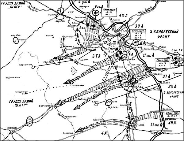 Но и положение войск группы армий «Центр», находящихся на территории Белоруссии, было угрожающим. Их тыловые коммуникации находились под серьезной угрозой возможного удара с юга продвинувшихся к Ковелю войск левого крыла 1-го Белорусского фронта. Одновременно правофланговые армии этого фронта позволяли провести наступательную операцию на бобруйском направлении. Армии левого крыла 1-го Прибалтийского фронта с северо-востока, а правого крыла 3-го Белорусского фронта с юго-востока охватывали всю витебскую группировку войск противника.