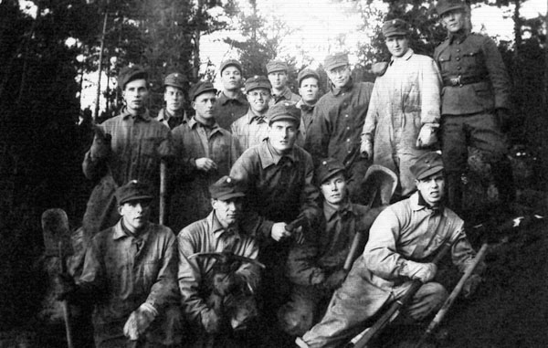 Финские солдаты в рабочих комбинезонах на строительстве укреплений. Подпись на обороте: 30/11/1939, в первый день финско-русской войны, на берегу Финского залива. «Экзамен» наших саперных курсов. Наш курс закончился как нельзя вовремя. А. Из коллекции Баира Иринчеева.
