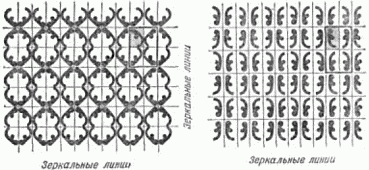 17 типов симметрии плоского узора не исчерпывают, конечно, всего разнообразия узоров, составляемых из одной и той же фигурки: художник должен указать ещё одно обстоятельство, – как расположить фигурку по отношению к граничным линиям ячейки. На рисунке 14 показаны два узора обоев с той же исходной фигуркой, но различно расположенной по отношению к зеркалам. Оба эти узора относятся к случаю 8.