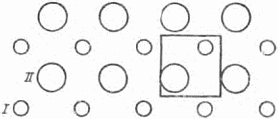 Рис. 15. Схема расположения атомов натрия (I) и хлора (II) на грани куба кристалла каменной соли.