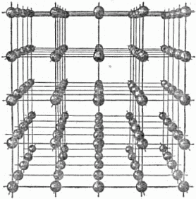 Основная особенность кристаллической структуры заключается в её повторяемости через строго одинаковые расстояния. Предположим, что мы сделали прогулку вдоль одной из проволочек рисунка 17. Выйдя из узла и продвигаясь вдоль проволоки, мы попадали бы всё в новые «местности». Но наши новые впечатления продолжались бы лишь до следующего узла. Начиная же от него, мы увидели бы полное повторение «пейзажа», уже знакомого нам по путешествию от первого до второго узла.