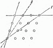Рисунок 18 даёт вид кристаллической решётки перпендикулярно к её грани; проведены следы некоторых узловых плоскостей, перпендикулярных чертежу. Из сказанного ясно, что у кристалла могут развиться грани, параллельные узловым плоскостям I, и не будет граней, параллельных редко усеянным узлами плоскостям II.