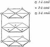 Попытайтесь представить себе ячейку расположенной так, чтобы эта диагональ шла вертикально. Левый задний кружок окажется при этом внизу и, единственный на нашем рисунке, будет принадлежать первому слою (центры других атомов этого слоя, принадлежащих соседним ячейкам, на рисунок не попали). На первом слое плотно лежит второй слой: центры шести его атомов, попавших на рисунок, – это крестики, расположенные по вершинам и серединам сторон треугольника. Третий плотный слой представлен шестью квадратиками, расположенными также по треугольнику. Наконец, четвёртый слой, повторяющий первый, содержит на нашем рисунке снова только один кружок.
