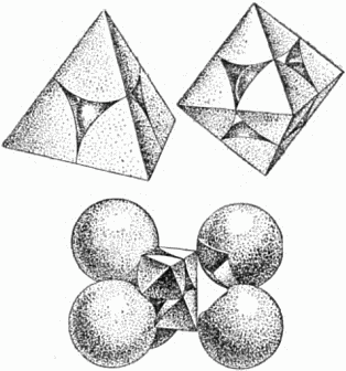 Рис. 23. Вверху: слева – малая, справа – большая пустоты в плотной упаковке шаров; внизу указано, как вырезана правая фигура.