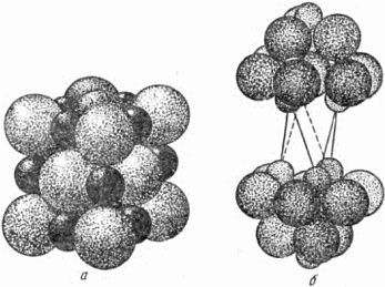 Однако в очень многих случаях – позднее мы скажем, в каких именно, – для воспроизведения расположения атомов в кристалле их можно уподобить шарам. Такое представление об атомах отнюдь не отражает всей их сложной природы, но правильно передаёт одно важное обстоятельство, а именно: рентгеновские исследования структуры кристаллов приводят нас к мысли, что кристаллы строятся по принципу наиболее плотной упаковки шаров.