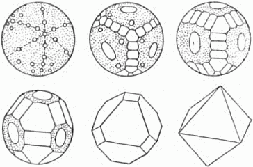 Сначала на поверхности шара появляются маленькие грани в форме кружков. Кружки постепенно увеличиваются и, соприкасаясь друг с другом, сливаются по прямым рёбрам. Шар превращается в многогранник. Затем одни грани обгоняют другие, часть граней зарастает, и кристалл приобретает свойственную ему форму (рис. 37).