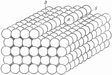 На рисунке 38 показана «недостроенная» упаковка атомов. В каком из обозначенных буквами положений прочнее всего будет удерживаться новый атом, пристроившись к кристаллу? Без сомнения, в А, так как здесь он испытывает притяжение соседей с трёх сторон, тогда как в Б – с двух, а в В – только с одной стороны. Поэтому сначала достраивается столбик, затем вся плоскость, и только потом начинается укладка новой плоскости.