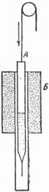 Одиночные кристаллы легкоплавких металлов получают обычно следующим способом (см. рис. 39). Металл расплавляют в стеклянной пробирке А с оттянутым концом. Пробирка подвешена на нити внутри вертикальной цилиндрической печи Б. При помощи нити пробирку медленно опускают вниз. Оттянутый конец постепенно выходит из печи, и металл начинает застывать. При этом из всех кристалликов выживает один; по мере опускания пробирки он продолжает расти вдоль её оси. В конце концов весь металл застывает в виде одиночного кристалла.
