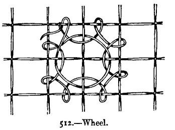 WHEELS are easy to work, and are begun in the centre. Four threads are taken across, as shown in design No. 511; the thread is twisted in bringing it back to the centre, and the wheel formed by passing the thread under and over the netting and the crossing threads. It is fastened off on the back of the several wheels.
