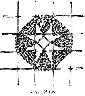 Wheel No. 513 is a square wheel, and is worked in the same manner, with the addition of point d'esprit loops, through which, and under and over the cross-twisted threads, 4 or 5 rows of thread are passed.