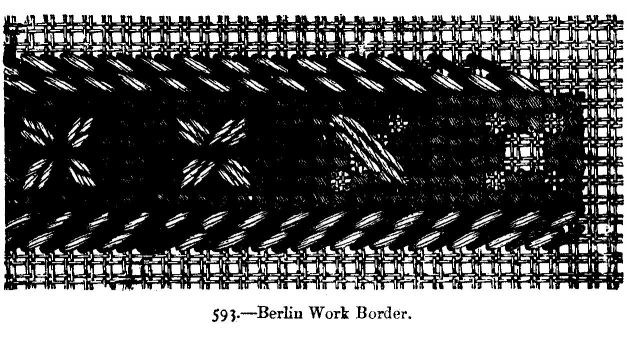 ILLUSTRATIONS 592 to 594.–Three Berlin wool work borders for trimming baskets, &c. No. 592.–The 2 outer rows which edge the border are worked in long straight cross stitch; each stitch is crossed in the centre with a back stitch.