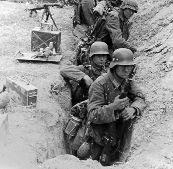 Немецкие пехотинцы перед атакой на Перекопе. Позади солдат противотанковое ружье и плита 50-мм миномета.