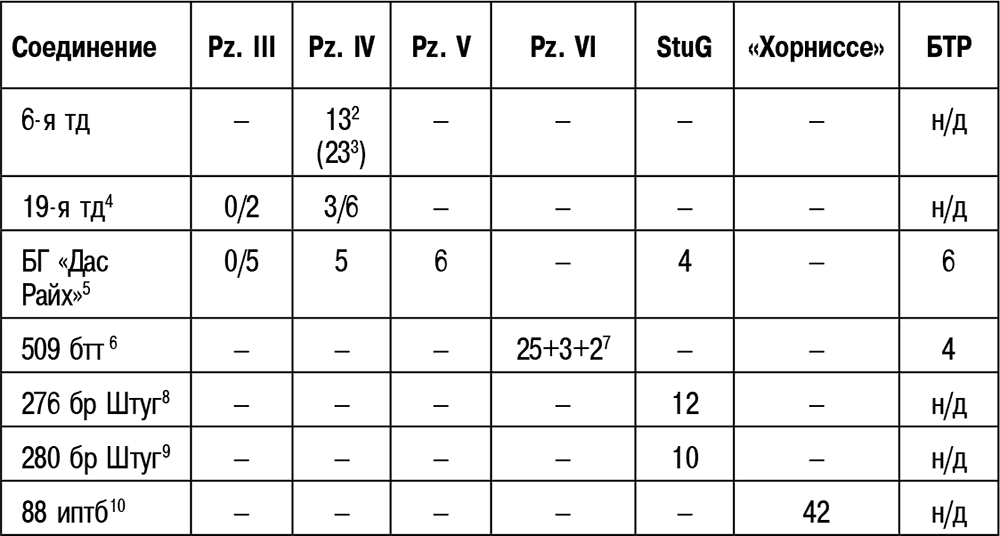 Кроме того, в вермахте широко практиковалось усиление одних соединений за счет других. Это приводило к некоторому перемешиванию войск, но данная практика сохранялась с 1941 по 1945 г.[33] Соответственно 19-я танковая дивизия была усилена, во-первых, отдельными частями из состава 8-й танковой дивизии. Это был так называемый «танко-гренадерский полк Нейсе» (один сильный и один средней силы мотопехотный батальон), зенитки и САУ с 75-мм орудием. В итоге в составе 19-й танковой дивизии насчитывалось 5 «Веспе» и 6 «Хуммелей», 11 «Мардеров» с 75-мм орудием и еще 2 САУ этого типа, переданные из 8-й танковой дивизии[34]. Во-вторых, ей были подчинены подразделения 9-го танкового полка 25-й танковой дивизии. Все это делало 19-ю танковую дивизию серьезным противником для войск 1-й гвардейской армии.