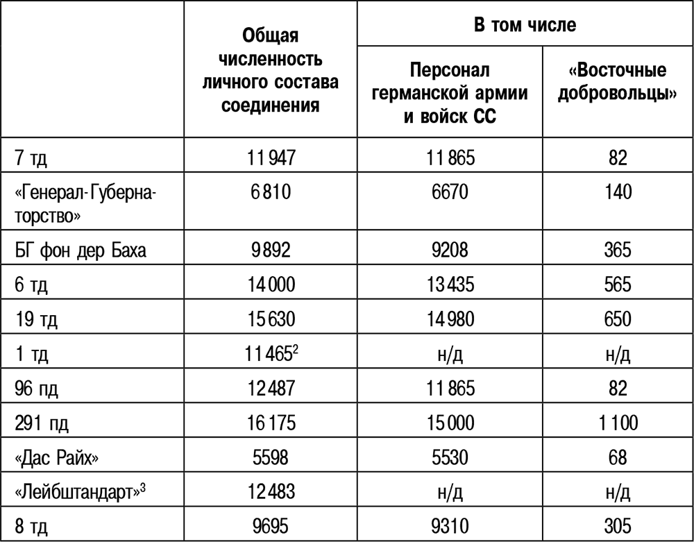 По немецким мемуарам и некоторым историческим работам может сложиться обманчивое впечатление, что в 1944 г. бои вели немногочисленные отряды вермахта, буквально тонувшие в море наступавших «монголов». Если обратиться к реальным цифрам численности немецких соединений, то получается следующая картина (см. таблицу).