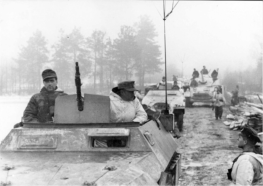 Колонна 16-й тд на марше. На переднем плане БТР SdKfz251.