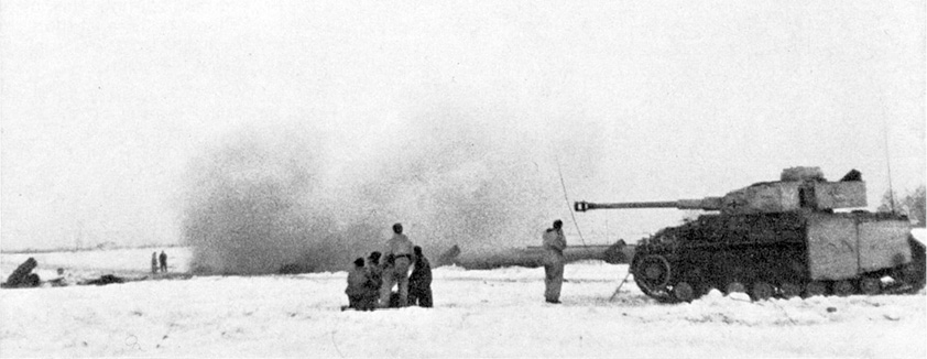 Перед атакой. Экипаж Pz.IV наблюдает за стрельбой «скрипух», шестиствольных реактивных минометов.