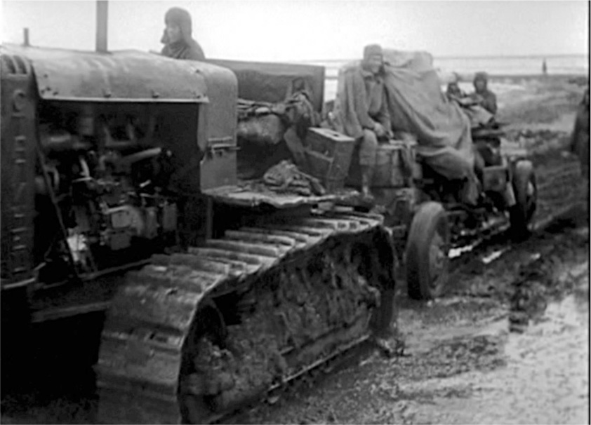 Только гусеничная техника уверенно преодолевала весеннюю грязь. Трактор «Сталинец» С-65 тянет 85-мм зенитную пушку обр. 1939 г.