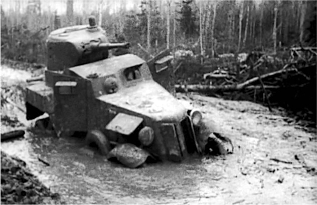 Бронеавтомобиль БА-10, с трудом пробирающийся по «бездонной» дороге. Машины этого типа были в основном потеряны в первый год войны, но в войсках еще оставались отдельные «долгожители».