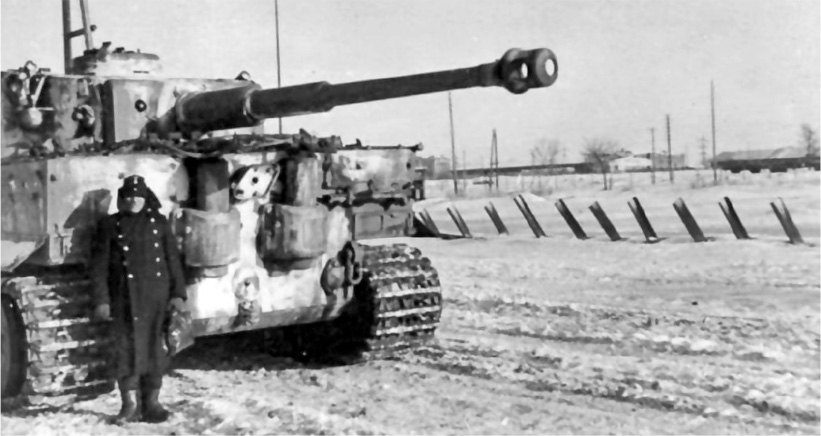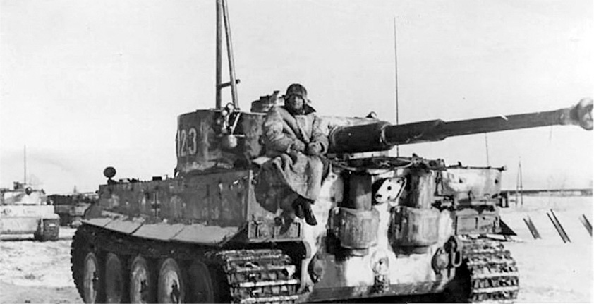 Немецкий солдат позирует на «Тигре» с бортовым номером 123 (машина из 1-й роты батальона)..