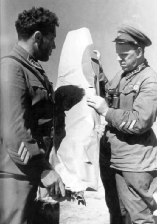 Зримые результаты поддержки с воздуха. Командующий советской авиагруппой на Халхин-Голе Я.В.Смушкевич демонстрирует Г.К. Жукову кусок перкаля со сбитого японского самолета.