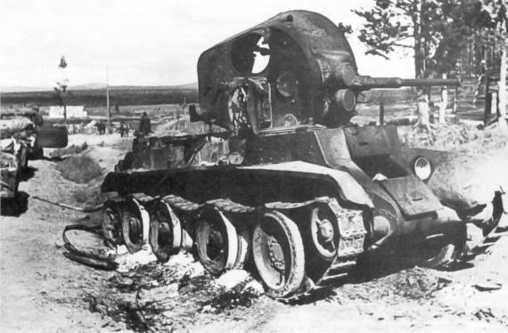 Сгоревший танк БТ-7. Японский офицер вспоминал, что горящие БТ «были похожи на дымы сталелитейных заводов в Осаке». Почерневшие остовы становились спутником боевого применения танков БТ под огнем скорострельных противотанковых пушек.