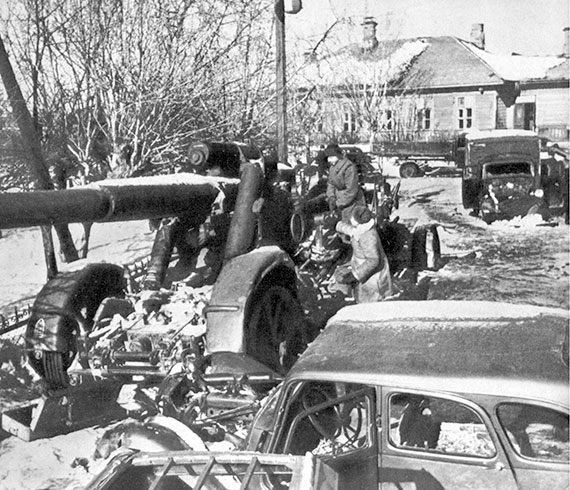 10,5-см легкая полевая гаубица leFH18 ведет огонь по наступающим советским войскам, декабрь 1941 г. «Артиллерия… является единственной защитой измотанных боями войск» (командующий 4-й танковой группой Гепнер, телефонограмма командующему ГА «Центр» от 21 декабря 1941 г.)