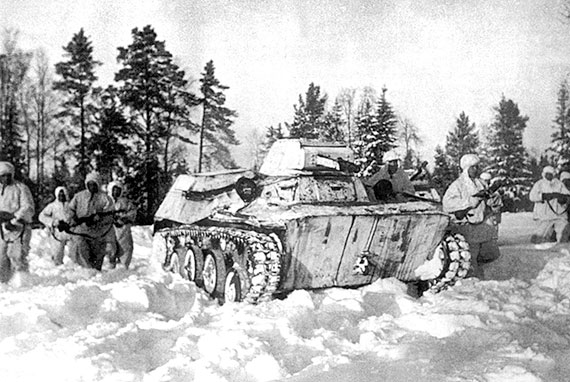Танк Т-40 поддерживает атаку пехотинцев 1-й Московской гвардейской мотострелковой дивизии