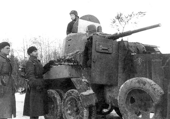 Командир 1-й гвардейской танковой бригады М. Е. Катуков (в центре) у броневика БА-10. Декабрь 1941 г.