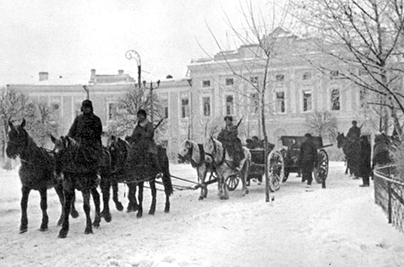 Советские артиллеристы входят в освобожденный Калинин. Шестерка лошадей тянет 76,2-мм пушку Ф-22 с передком. Декабрь