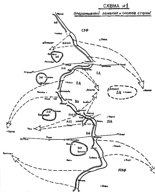 «с переходом армий Юго-Западного фронта в наступление, ударом левого крыла фронта в направлениях на <Варшаву>, Седлец, Радом,<разбить Варшавскую группировку и овладеть Варшавой> [способствовать] <во взаимодействии с> Юго-Западным фронтом разбить Люблинско-Радомскую группировкку противника, <выйти на р. Висла и подвижными частями овладеть Радом> [и обеспечить эту операцию со стороны Варшавы и Восточной Пруссии]»[26].