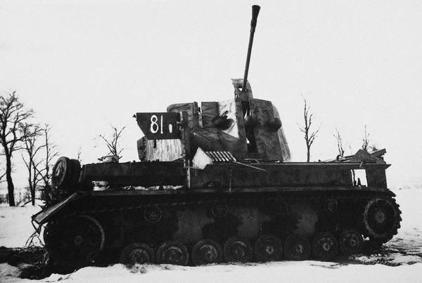 Зенитный танк Flakpanzer IV «Möbelwagen» с 37-мм пушкой Flak 43, захваченный частями Красной Армии в полной исправности в пригороде Будапешта. Февраль 1945 года. Борта рубки откинуты, хорошо видны 37-мм снаряды, лежащие на переднем плане, и каски экипажа, висящие на орудийном щите. Танк имеет камуфляж в виде широких полос (АСКМ).