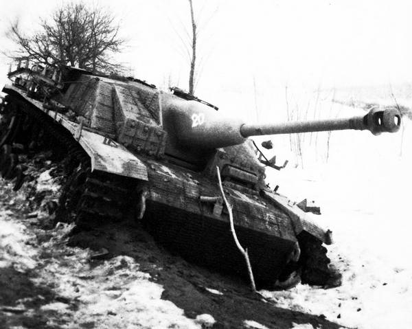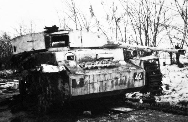 Немецкий танк Pz.IV Ausf.H, подбитый в районе озера Балатон. Февраль 1945 года. Машина имеет зимний камуфляж, нанесенный очень тщательно (АСКМ).
