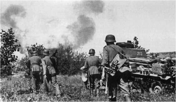 Как вспоминал служивший в тот период в этом соединении полковник Ритген, «сопротивление противника в нашем секторе оказалось намного сильнее, чем ожидалось. Путь нам преграждали шесть противотанковых рвов, прикрывавшихся пехотинцами и снайперами, засевшими на деревьях. К счастью для нас, у них не было противотанковых пушек и мин. Поскольку никто не сдавался, пленных не было. Однако вскоре танки остались без боеприпасов, что до этого ни разу не случалось в ходе кампаний в Польше и Франции. Пополнение боеприпасов зависело от грузовиков, застрявших в пробке где-то позади»[65]. По словам Ритгена, ни один мост на пути его дивизии не был взорван, однако их ограниченная грузоподъемность заставляла танки форсировать реки вброд. Интересно отметить, что именно в полосе 6-й танковой дивизии были использованы диверсанты «Бранденбурга». С их помощью был захвачен мост у селения Конгайлы. Судя по карте, это мост даже не через реку, а через крупный овраг. Противником 6-й танковой дивизии поначалу были левофланговые части 125-й стрелковой дивизии.