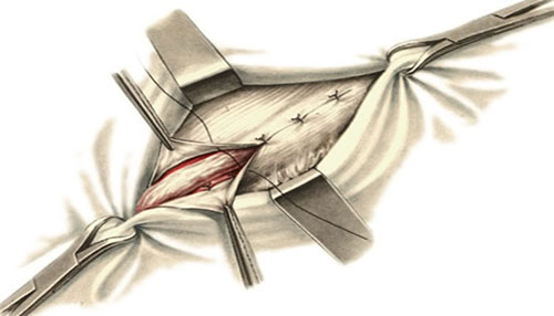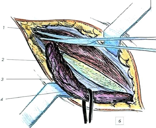 Сверху захватывают в шов 4 слоя: верхний лоскут апоневроза наружной косой мышцы вместе с краем внутренней косой и поперечной мышц и поперечную фасцию.