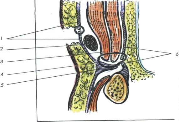 Рисунок 3. Схема пластики по Бассини в сагиттальной плоскости. 1- апоневроз наружной косой мышцы; 2- семенной канатик; 3-внутренняя косая мышца живота; 4-поперечная мышца живота; 5-паховая связка; 6- поперечная фасция;